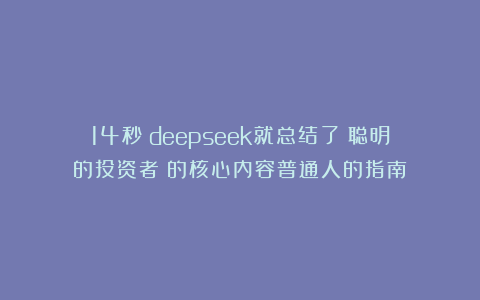 14秒″deepseek就总结了《聪明的投资者》的核心内容普通人的指南 6个月前 你们觉得deepseek总结的怎么样? 标签:deepseek总结 上一篇文章如何用deepseek一年赚到100万?普通人都能做 下一篇文章中药变“毒药”,短短几个小时致死!提醒:5种中药别拿来当补品