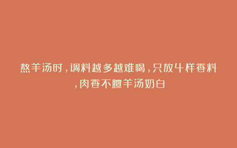 综上所述,熬羊汤时调料并非越多越好,而是应该选择关键的几种香料进行搭配和使用。小茴香、山奈、桂枝和白芷这四种香料正是熬羊汤时的绝佳选择。它们既能去除羊肉中的腥味和异味,又能增加汤的香味和层次感,使羊汤更加鲜美和浓郁。在熬羊汤时,我们只需将这四种香料适量添加到汤中,就能轻松熬出肉香不膻、汤色奶白的羊汤来。