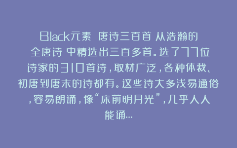 Black元素:《唐诗三百首》从浩瀚的《全唐诗》中精选出三百多首。选了77位诗家的310首诗,取材广泛,各种体裁、初唐到唐末的诗都有。这些诗大多浅易通俗,容易朗诵,像“床前明月光”,几乎人人能诵… 8个月前 《唐诗三百首》从浩瀚的《全唐诗》中精选出三百多首。选了77位诗家的310首诗,取材广泛,各种体裁、初唐到唐末的诗都有。这些诗大多浅易通俗,容易朗诵,像“床前明月光”,几乎人人能诵。#欣赏唐诗三百首# #跟着读古诗# #今天学习古诗# 标签:唐诗三百明月光浅易 上一篇文章谁写的?这字与字之间、行与行之间,顾盼呼应,疏密得当 下一篇文章Black元素:《古诗三百首》涵盖了从先秦到明清众多诗人的作品,近两百位诗人的约三百首诗都在其中。可收藏#古籍古诗推荐# #古诗必读#