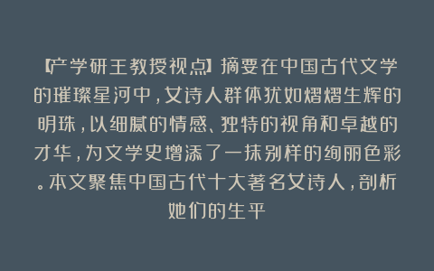 在中国古代文学的璀璨星河中,女诗人群体犹如熠熠生辉的明珠,以细腻的情感、独特的视角和卓越的才华,为文学史增添了一抹别样的绚丽色彩。本文聚焦中国古代十大著名女诗人,剖析她们的生平经历、创作风格、代表作品及其文学成就,探寻她们在封建礼教束缚下,如何突破困境,以笔为剑,书写出动人心弦的诗篇,展现古代女性在文学领域的非凡创造力与精神追求。