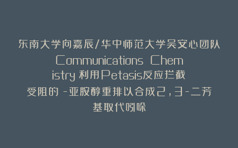 该工作以“Intercepting an avoided α-iminol rearrangement with a Petasis reaction for the synthesis of 2,3-diaryl substituted indoles”为题发表于Communications Chemistry(DOI: 10.1038/s42004-025-01528-9)。第一作者为东南大学化学化工学院2022级硕士研究生祝慧敏,通讯作者为东南大学向嘉辰副教授和华中师范大学吴安心教授。该研究工作得到了国家自然科学基金的大力支持。