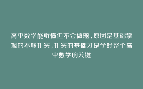 高中数学能听懂但不会做题,原因是基础掌握的不够扎实,扎实的基础才是学好整个高中数学的关键 8个月前 标签:学好扎实高中数学 上一篇文章《小巷人家》直到庄母卷走全部积蓄,黄玲才知,图南恨了她一辈子 下一篇文章口腔溃疡如何快速恢复