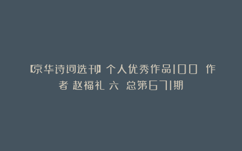赵福礼(网名: 老兵)1963年2月黑龙江省青冈县祯祥镇出生,1980年参军入伍,军旅生涯二十载!转业后在某金融单位工作。酷爱文学,喜欢诗词!曾在龙风学院接受诗词启蒙培训,后在望岳雅集诗词学校学习深造,并参与反哺教学工作至今!师从胡朝水校长!雅韵清风诗词学校常务校长!京华诗词选刊社长,笔墨书香诗社社长,丹霞诗词学社顾问,中华诗词学会会员。业余时间热衷于写作诗词短文,曾在地方文学、城市金榜头条、百度订阅号发表作品若干!