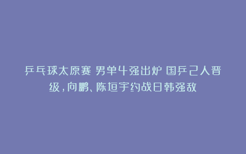北京时间4月12日,乒乓球WTT太原常规赛男单四强出炉,国乒总计十二人参加该项目,最终剩余两人晋级,向鹏、陈垣宇不负众望过关,接下来二人将分别迎战日本选手松岛辉空、韩国主力安宰贤,继续冲击决赛资格——八强赛详细战况请看下文。