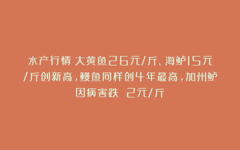 水产行情:大黄鱼26元/斤、海鲈15元/斤创新高,鳗鱼同样创4年最高,加州鲈因病害跌 2元/斤!