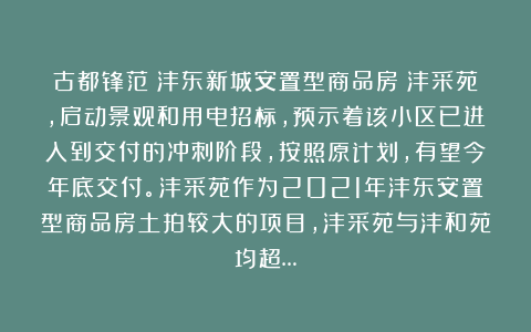 古都锋范:沣东新城安置型商品房:沣采苑,启动景观和用电招标,预示着该小区已进入到交付的冲刺阶段,按照原计划,有望今年底交付。沣采苑作为2021年沣东安置型商品房土拍较大的项目,沣采苑与沣和苑均超…