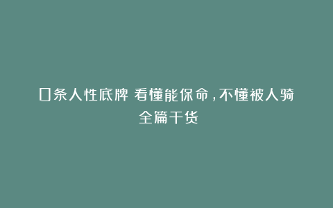 0条人性底牌:看懂能保命,不懂被人骑!(全篇干货) 6个月前 【最后忠告】 这些底牌不是教你做恶人,而是让你身披铠甲再做好人。可以帮人,但先立好规矩;可以信任,但留好证据。记住:没有霹雳手段,别谈菩萨心肠! 标签:别谈底牌留好 上一篇文章《回答我》爆火!素人10天涨粉2W,用Deepseek+即梦AI教你3分钟学会制作! 下一篇文章[魅力中国]嫣红姹紫_随拍彭州牡丹园