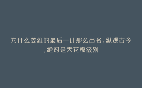 姜维的最后一计有人说给了大汉400年一个体面的退场,也有人这一计死了三个武庙(姜维,钟会,邓艾这都是大兵团作战的人才,魏国刚刚升起的两颗巨星),姜维告诉了我们世人忠义之士的顶峰,姜维的计只有他和刘禅知道,姜维赌上的不仅是自己的姓名,更是古人最看重的名节(最开始都以为姜维投降钟会,后面谋反失败被杀)。