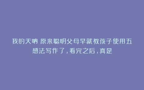 我的天呐!原来聪明父母早就教孩子使用五感法写作了,看完之后,真是被惊艳到了。不得不说这个五感法真的好,按照这个万能公式去写,任何主题都能轻松写出来。这份五感法写作,建议家长们替孩子保存下来,有空让孩子多按照这个万能公式练一练,坚持一段时间,你就会看见惊喜。孩子想写不出作文都难,任何主题都能轻松驾驭。