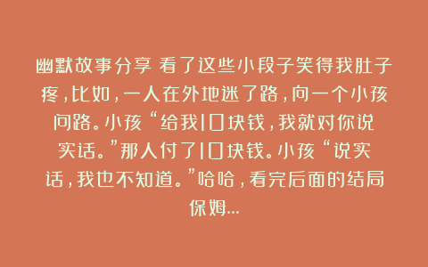 哈哈,看完后面的结局保姆说的话太有意思了,这小段子幽默风趣,有品有味,精彩纷呈,笑点十足,搞笑而有内涵,真是搞笑界的天花板,真是高手在民间啊,作者真的值得佩服,看完让人捧腹大笑,笑一笑,十年少,烦恼全忘掉。🙏感谢朋友们的关注!#幽默搞笑小故事分享# #搞笑# #什么笑话让你看一次笑一次?#